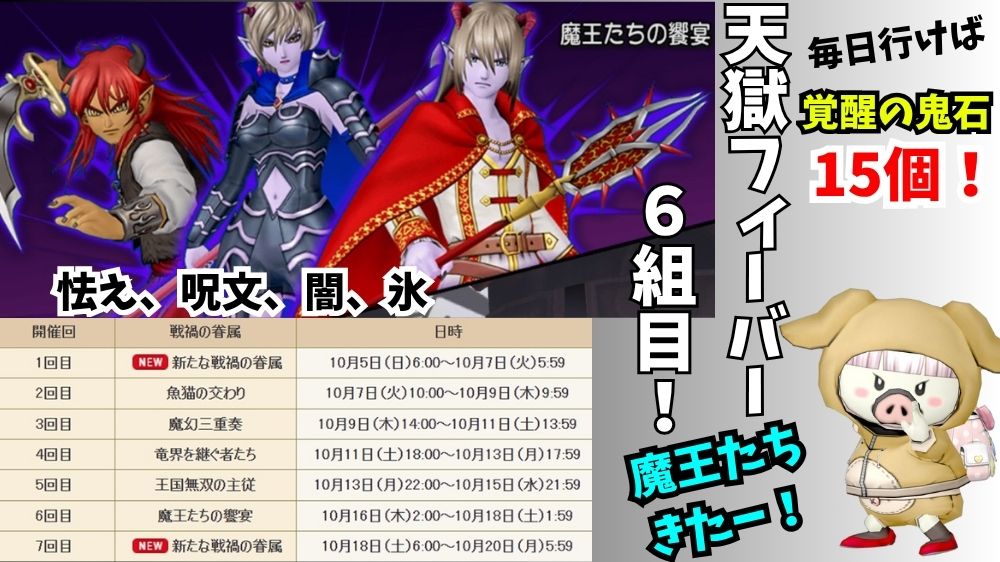 天獄フィーバー6組目~魔王たちの饗宴~は、10月18日(土)1時59分までブヒ