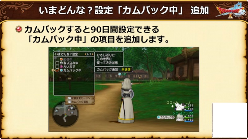 フレンドにカムバック中を知らせることができる