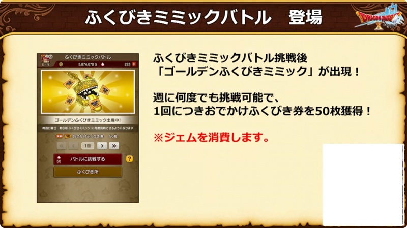 「ふくびきミミック」挑戦後は「ゴールデンふくびきミミック」が出現! ジェムを消費して挑戦できる