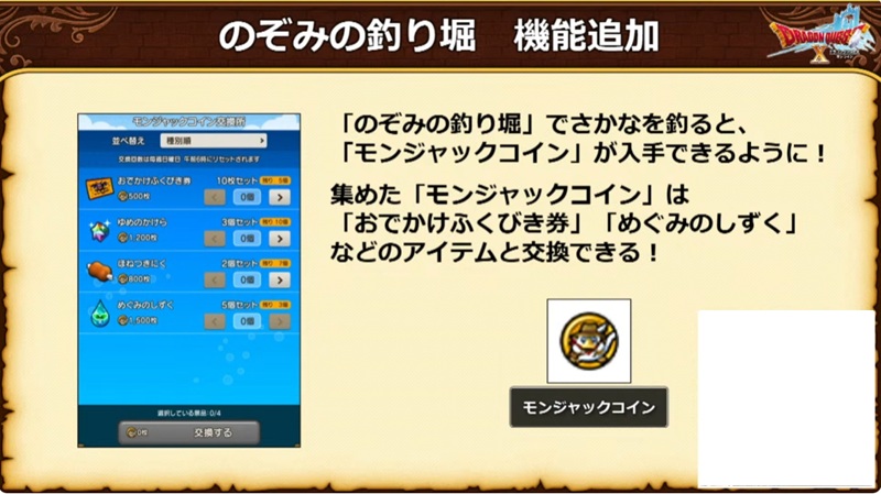 集めた「モンジャックコイン」は「おでかけふくびき券」や「めぐみのしずく」などのアイテムと交換できる
