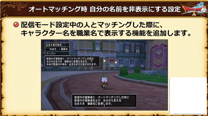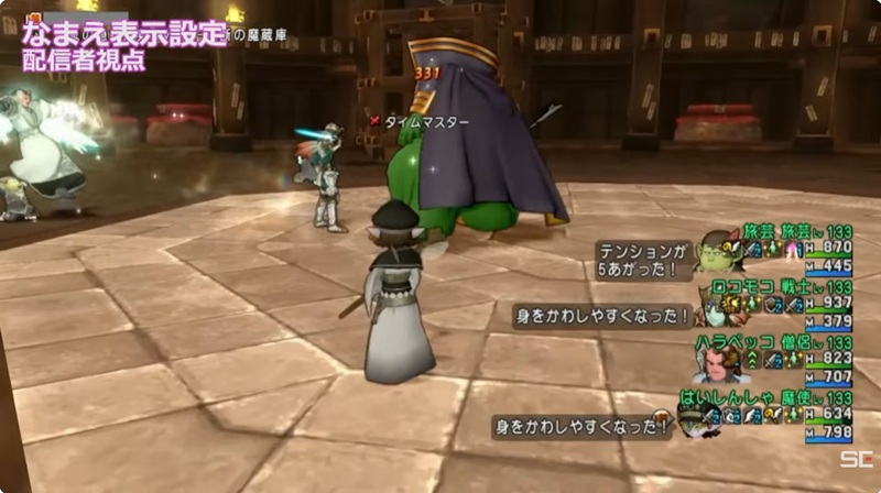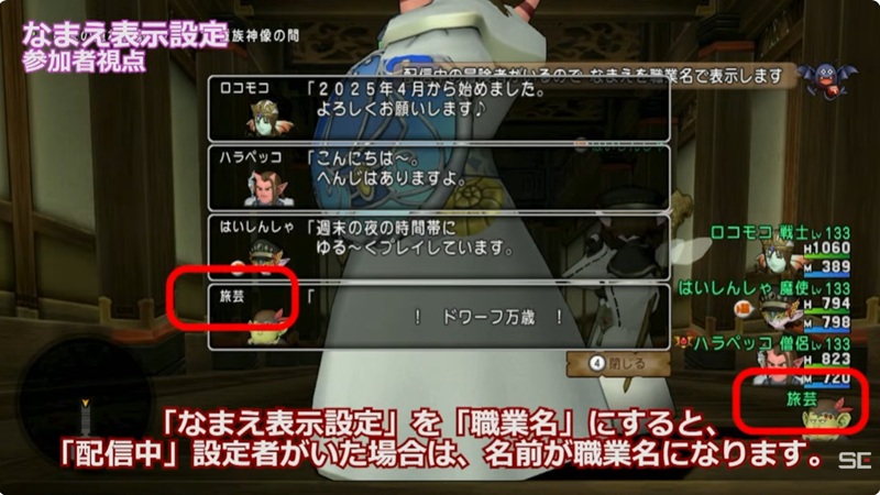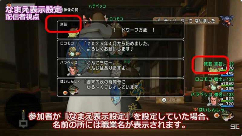 名前表示設定を職業名にすると、配信者からは名前が職業名で表示される