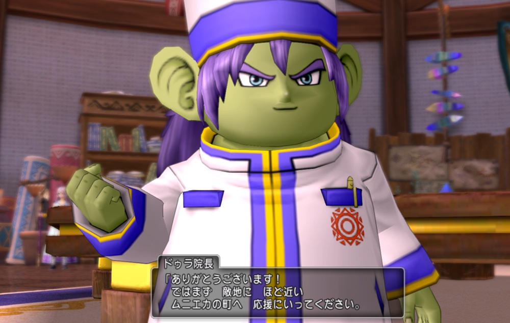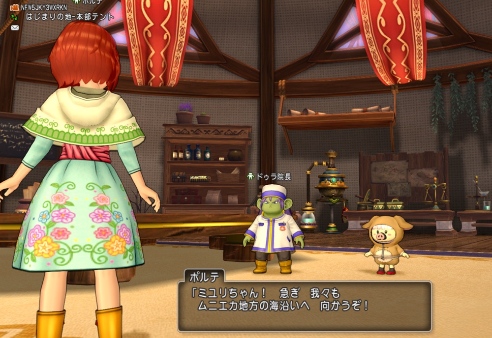 はじまりの地の本部テントに入り、ドゥラ院長に話すブヒ🐷
