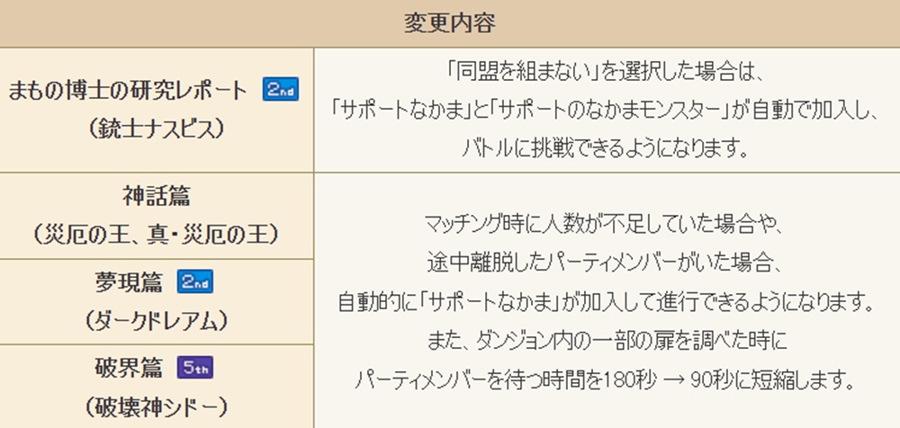 一部の「同盟バトル」において「サポートなかま (なかまモンスター)」を加えて参加できるようになる
