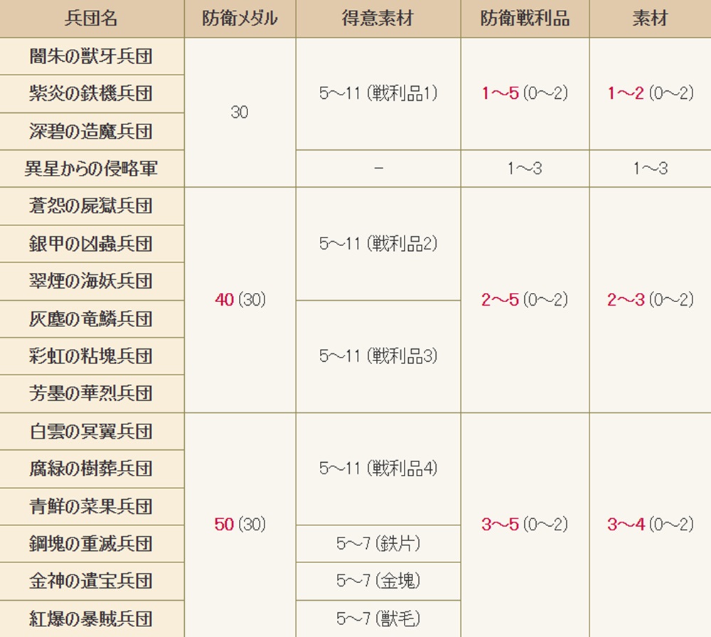「得意素材」…各兵団で獲得しやすい「防衛戦利品」や「素材」