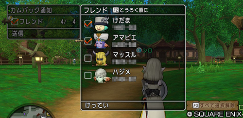 DQXショップギフトをプレゼントできる対象は、ゲーム内で「フレンド」登録されているキャラクターのみ