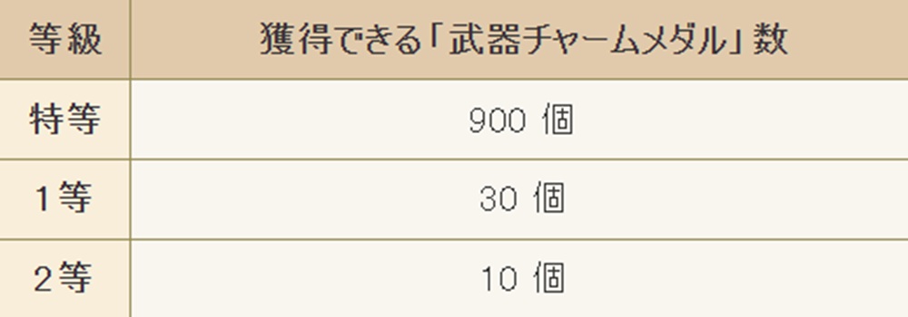 各ふくびき所の特等/1等/2等の賞品で入手できる「武器チャームメダル」の個数