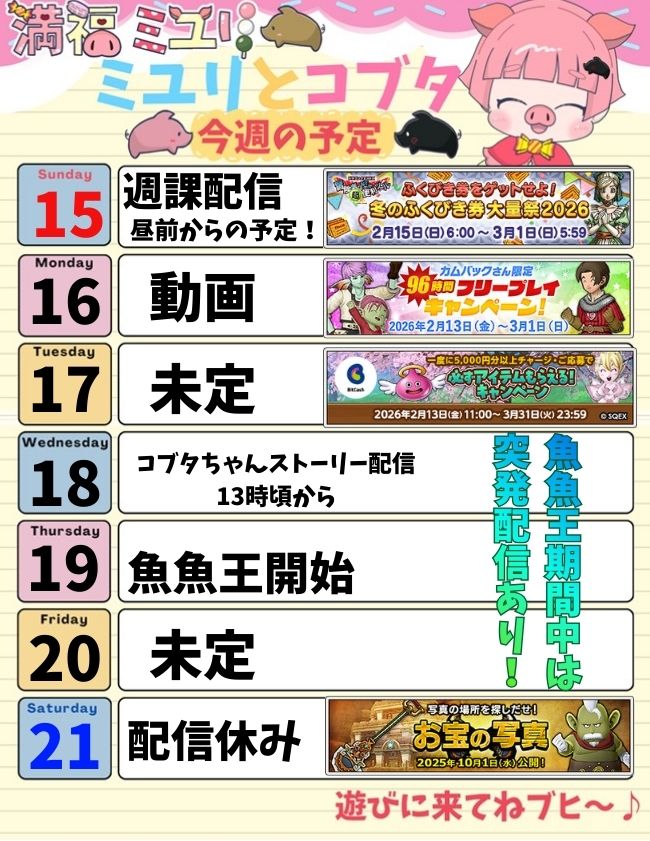 それまでに週課と15日更新コンテンツ終わらせないとブヒ💦