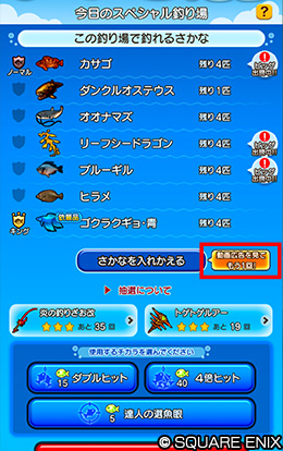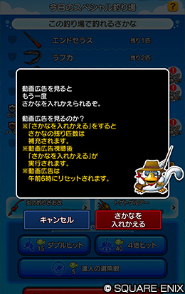 のぞみの釣り堀の「今日のスペシャル釣り場」にて、「さかなを入れかえる」を利用した後、広告動画を再生することで、さらにもう1回「さかなを入れかえる」を無料で1回行えるようになる
