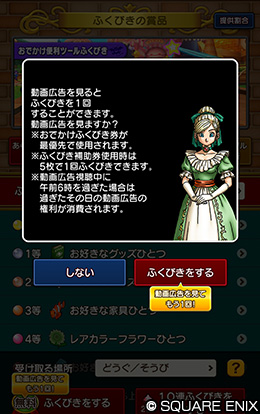 ふくびき所の「ふくびきをする」にて、無料で「ふくびきをする」を利用した後、広告動画を再生することで、さらにもう1回ふくびきを行えるようになる