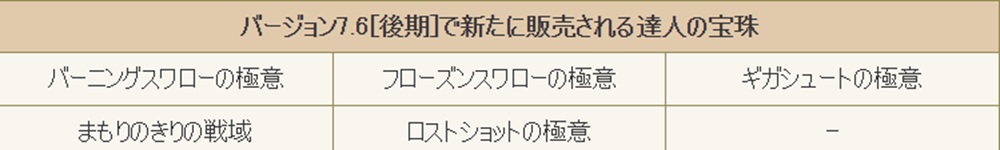 バージョン7.6[前期]で登場した、以下の達人の宝珠が購入できるようになる