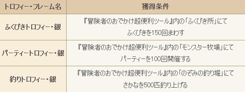 「ふくびき所」「モンスター牧場」「のぞみの釣り堀」に、新しいトロフィーを追加